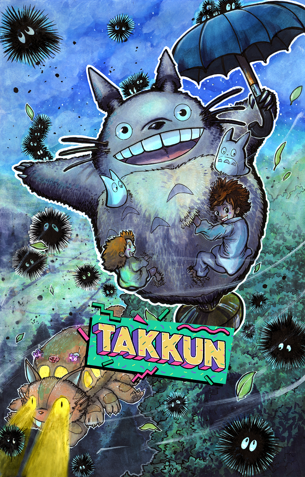 11 x 17" Print featuring Satsuki, Mei, Makkuro kurosuke, Catbus, and Totoro!